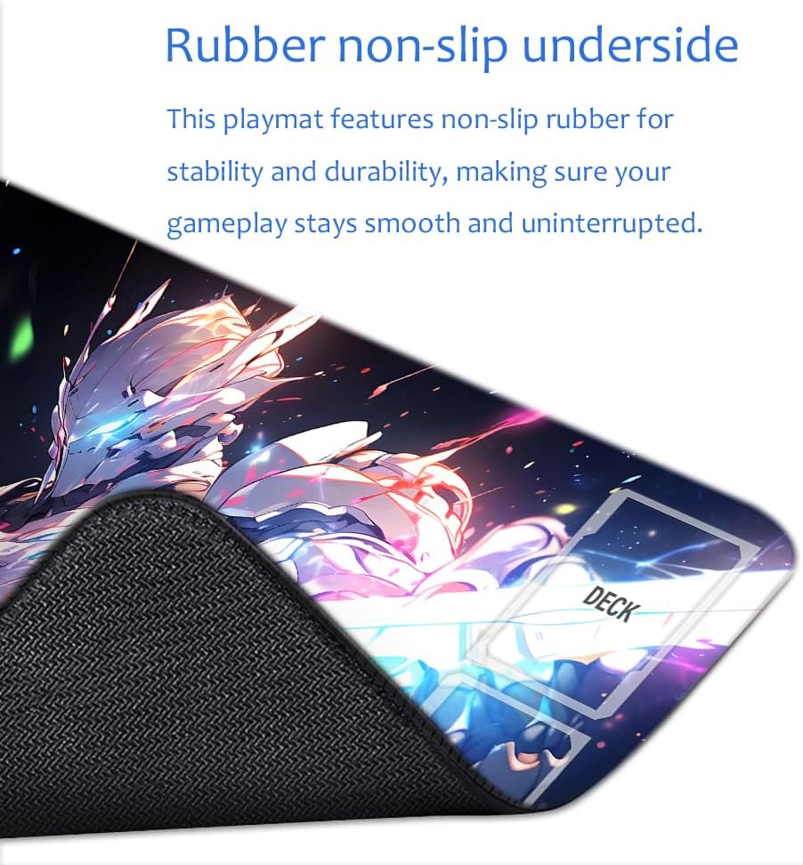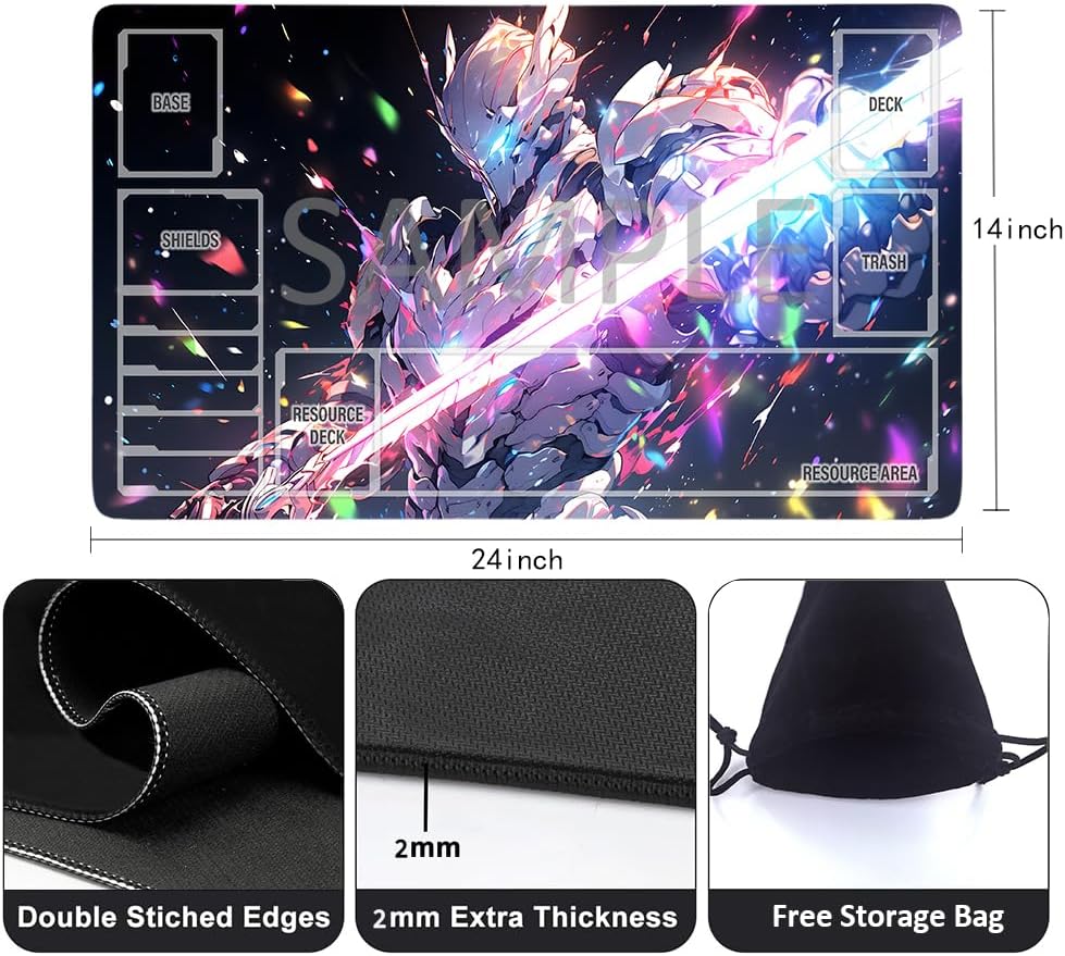 Elevate your card gaming experience with this premium GCG playmat, designed specifically for trading card game enthusiasts. Measuring a generous 24 by 14 inches, this mat provides ample space for your gaming needs while featuring clearly marked zones for organized gameplay. The playmat comes complete with a convenient storage bag, making it perfect for transport to tournaments or friendly matches. Whether you're a new player learning the ropes or a seasoned veteran, this unofficial GCG compatible mat helps maintain card positioning and protects your valuable cards during play. The smooth surface allows for easy card movement while preventing unwanted sliding, creating an optimal playing experience. Its professional layout and durable construction make it an essential accessory for any serious card game player.
